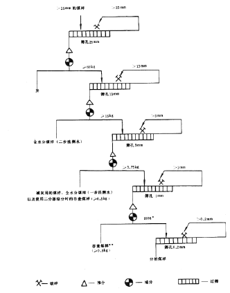 3.2 煤樣應(yīng)按本標(biāo)準(zhǔn)規(guī)定的制備系統(tǒng)(見(jiàn)圖2)及時(shí)制備成分析煤樣,或先制成適當(dāng)粒級(jí)的煤樣。如果水分大,影響進(jìn)一步破碎、縮分時(shí),應(yīng)適當(dāng)?shù)剡M(jìn)行干燥。