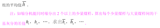 A1 首先將煤樣混勻后縮分為兩部分(或縮分出兩部分),然后,再分別把每一部分當(dāng)作一個(gè)煤樣單獨(dú)處理,以得到兩個(gè)分析煤樣。分別化驗(yàn)這兩個(gè)分析煤樣的水分、灰分,算出干基灰分,并求出兩者干基灰分的差值(h)。