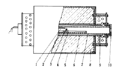 5—爐殼;6—剛玉外套管;7—剛玉內套管;8—泡沫氧化鋁保溫磚;9—電板片;10—觀察孔